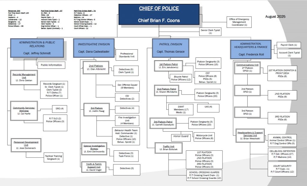 As of his latest promotion in 2022, Chief Coons was prior serving as the Captain of Administration and Public Relations.  His responsibilities included Public Information Officer, Community Services Unit, Personnel Development, and the Records Management Unit. He was promoted to Chief effective November 30th, 2023.